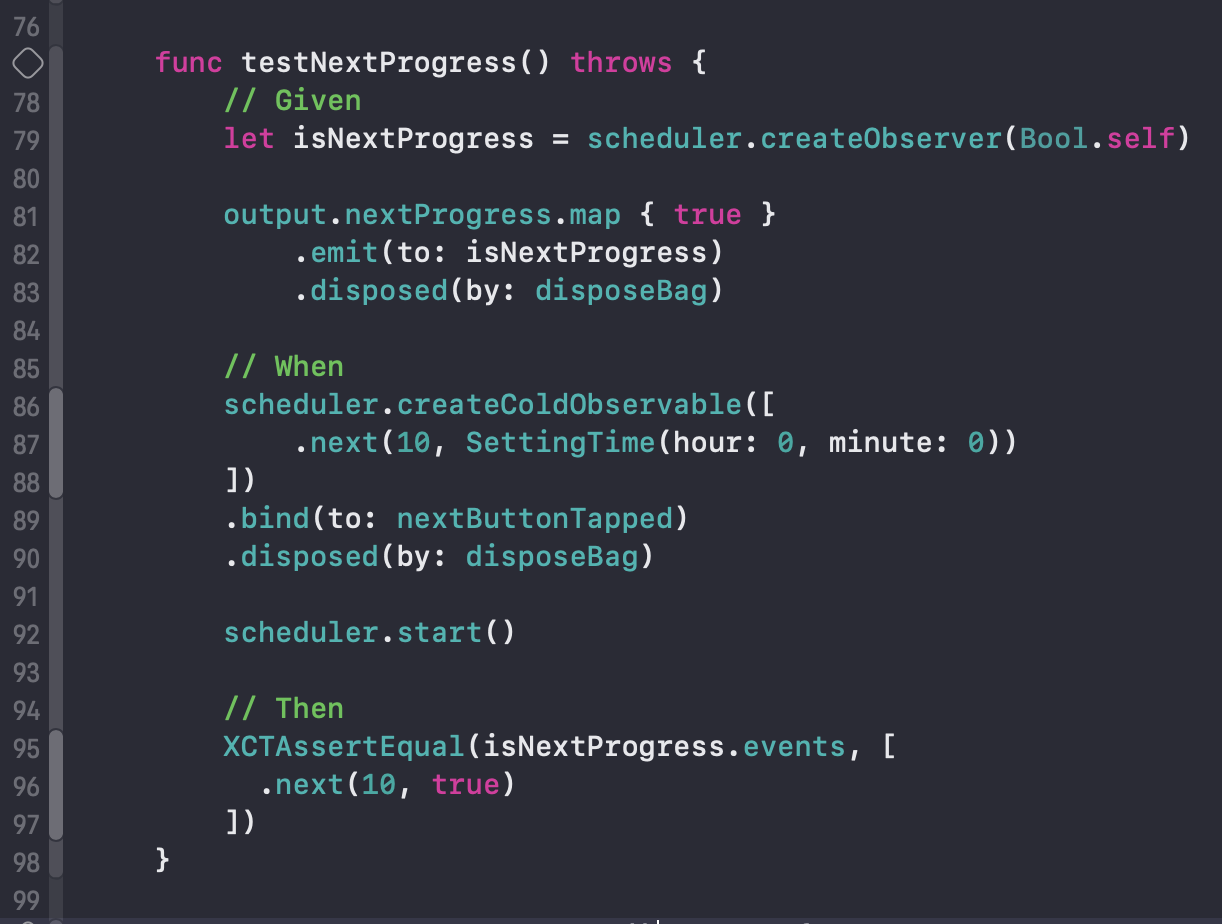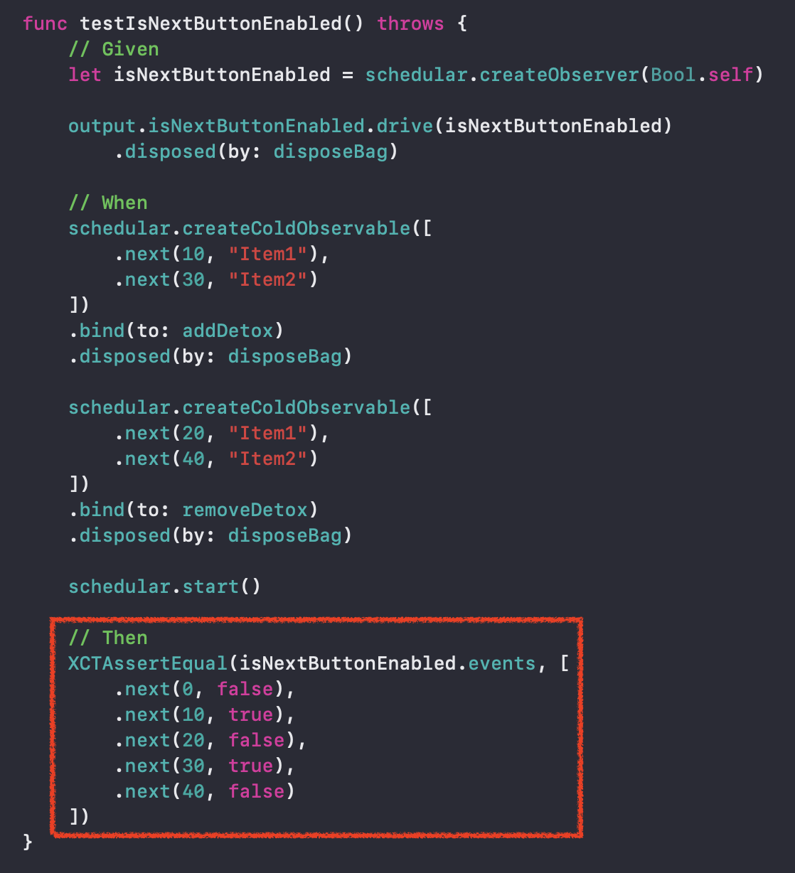가상 시간의 이벤트들을 방출하는 옵저버블을 만들고, XCTAssertEqual 을 통해 events 를 비교하게 됩니다.