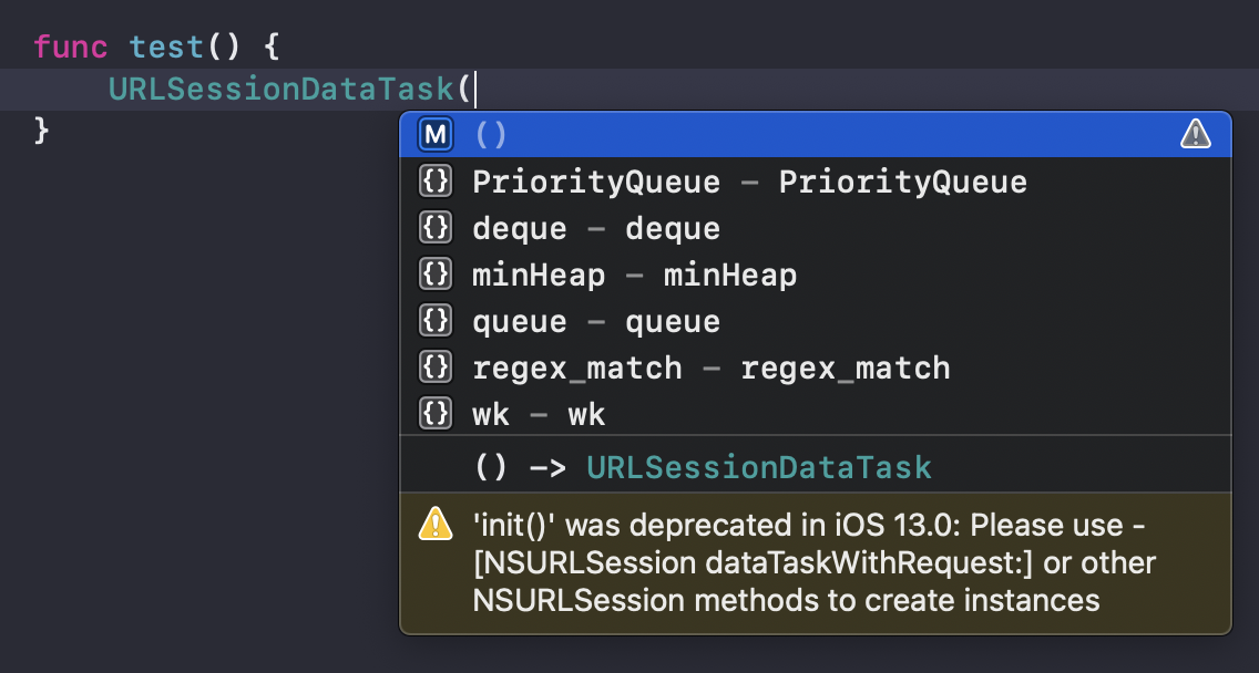 하지만 iOS 13 에서는 URLSessionDataTask 이니셜라이저가 deprecated 되어 컴파일 경고가