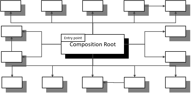 Compostion Root 에서는 의존성 트리를 구성하고 Factory 형식으로 하위 객체에 필요한 의존성을 모두 제공하게 됩니다. 클로저로 이어지는 이니셜라이저 Depth 를 줄이기 위하여 Pure 라는 프레임워크를 사용할 수 있습니다.