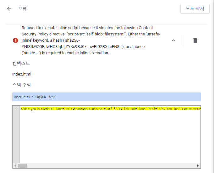 리액트의 경우 인라인 스크립트를 사용하기 때문에, manifest.json 에서 자바스크립트 실행 권한을