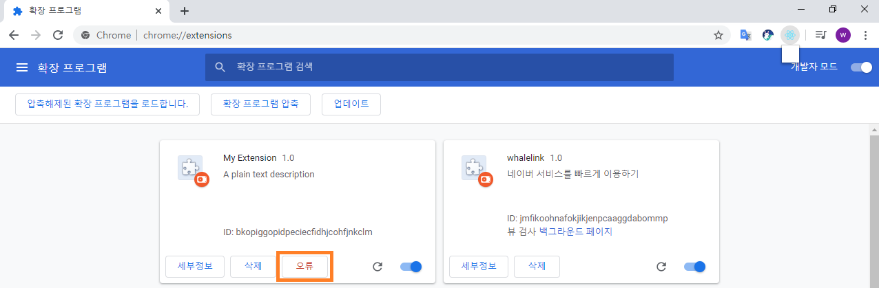 "오류" 버튼을 클릭해서 해당 내용을 살펴봅니다.