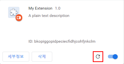 그 다음 확장 프로그램 설정창에 가서 새로고침을 누르고, 확장앱을 클릭해봅니다.